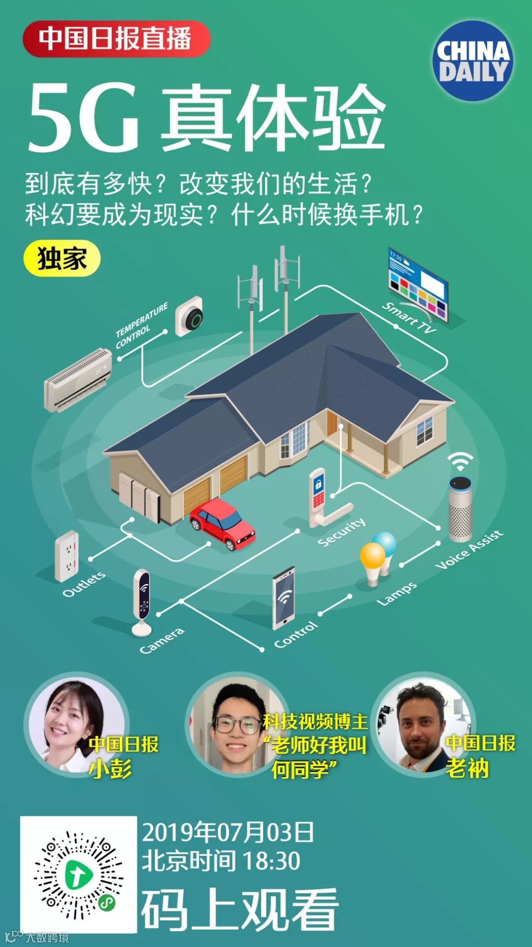 他将携手中国日报Vlog网红小姐姐彭译萱、英国小伙老衲(Nathan Williams)一起体验5G!