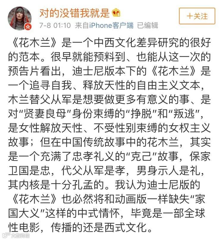 有的网友则从预告片中看到中西方文化和价值观的差异,认为木兰从军作为一个充满“家国大义”的中国传统故事,被迪士尼改编后,主要表现的价值观变成了女性的个性解放和对礼教束缚的挣脱。