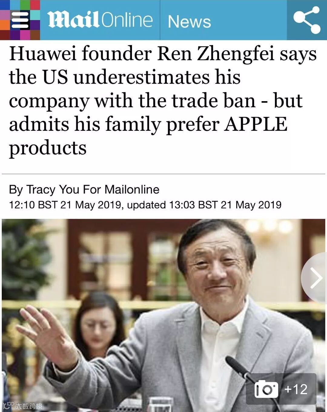 华为创始人任正非表示,美国在贸易限令中低估了华为的实力,但是却又承认家人更喜欢苹果产品