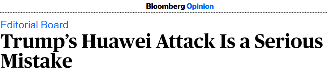 彭博社20日发表社论,标题为《特朗普对华为的攻击是一个严重的错误》。