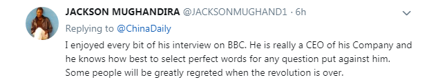 他接受BBC采访的内容让我非常赞赏。他真的是当之无愧的CEO,对于那些针对他的问题,他知道如何选出最好的词来。当对华为的打压结束之后,某些人会后悔的。