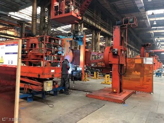 巨大的车间,呲呲的焊接声,焊花四溅,焊接机械臂和手工焊工人有序地工作着。
