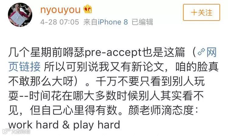 但最近入选美国科学院外籍院士的中国科学家颜宁在微博上就曾表态:work hard and play hard。她的微博画风轻松幽默,跟印象中的科学家大相径庭。