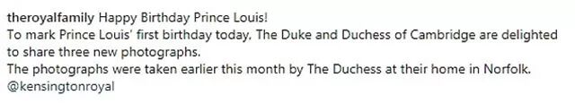 “为了庆祝路易小王子1岁生日,剑桥公爵夫妇很高兴和大家分享三张新照片。”