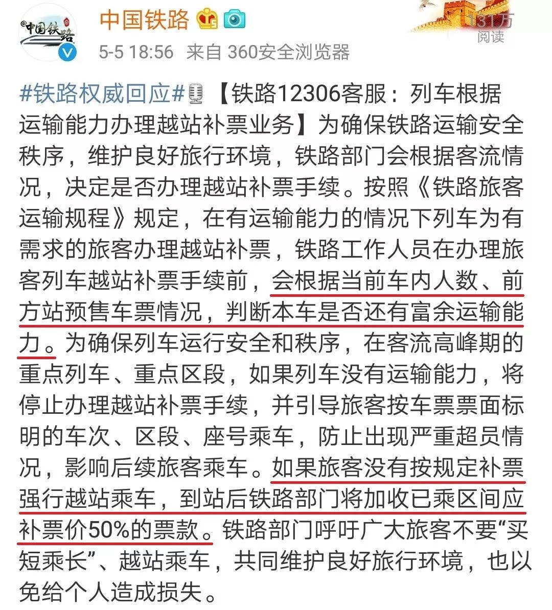 5月5日,中国铁路总公司在其官微上回应此事: