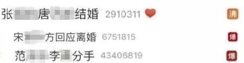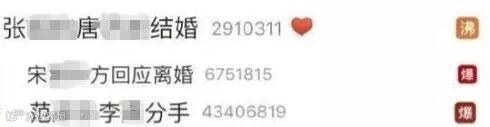 先有张姓男艺人和唐姓女艺人的结婚信息,频频出现新tag登上热搜榜单;接着韩国双宋明星夫妇离婚直接点“爆”微博热搜榜;这还没完,紧随其后的范姓女艺人与李姓男艺人的分手新闻,再次让微博热搜榜“沸”了起来。