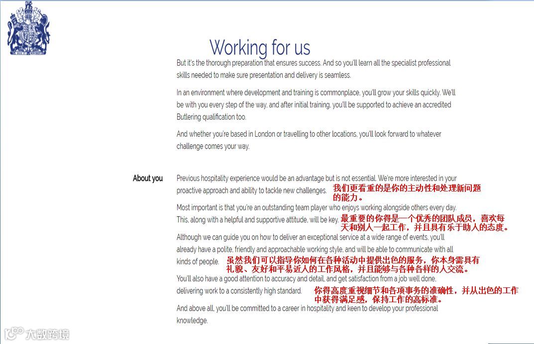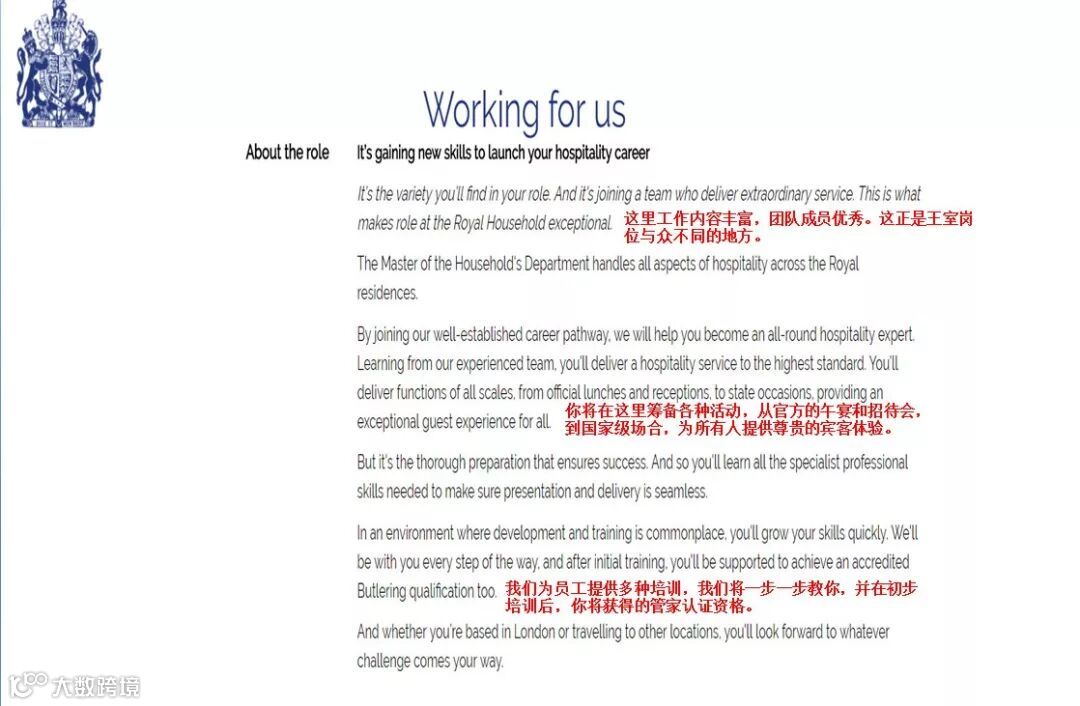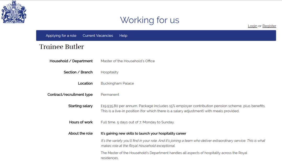 这不,今年女王伊丽莎白二世在王室官网上又贴出了招聘见习管家(trainee butler)的公告, 年薪17万(人民币),五休二,在白金汉宫上班: