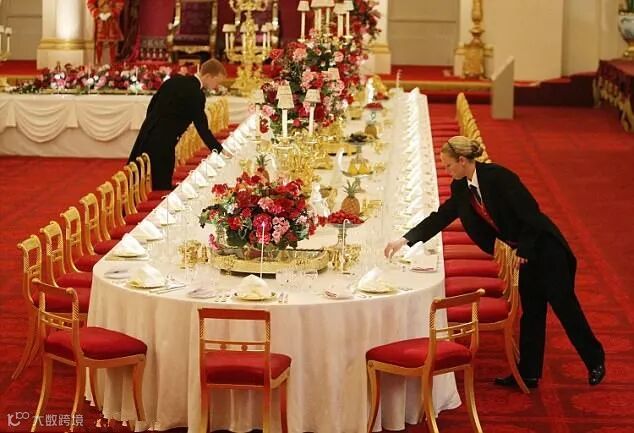 很多这样的宴会都有180位客人围坐在马蹄形的大桌子旁,你必须确保酒杯都擦得很干净,银质餐具摆放在正确的位置。