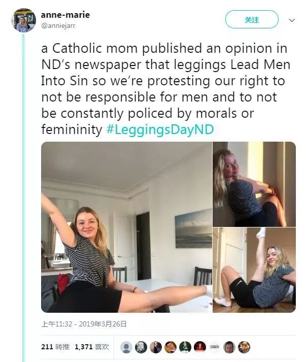 “一位信仰天主教的母亲在圣母大学校报上发表一篇文章,称女人的紧身裤让男人堕落。我们想抗议这个观点。男人堕落不是我们的责任,我们也不想时常被一些人自以为是的道德观念和女权主义审视。”