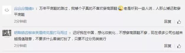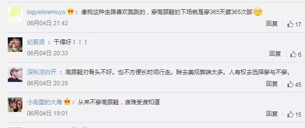 她写道:“穿着高跟鞋很难走路,你不能跑,脚会疼。穿高跟鞋都是出于礼仪要求”。她指出,男性不会面临同样的境况。