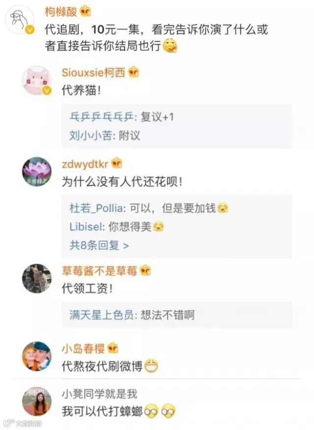 随后出现了各种各样的代理服务,包括代撸猫、代闹钟(真人叫醒)等,可谓是五花八门。