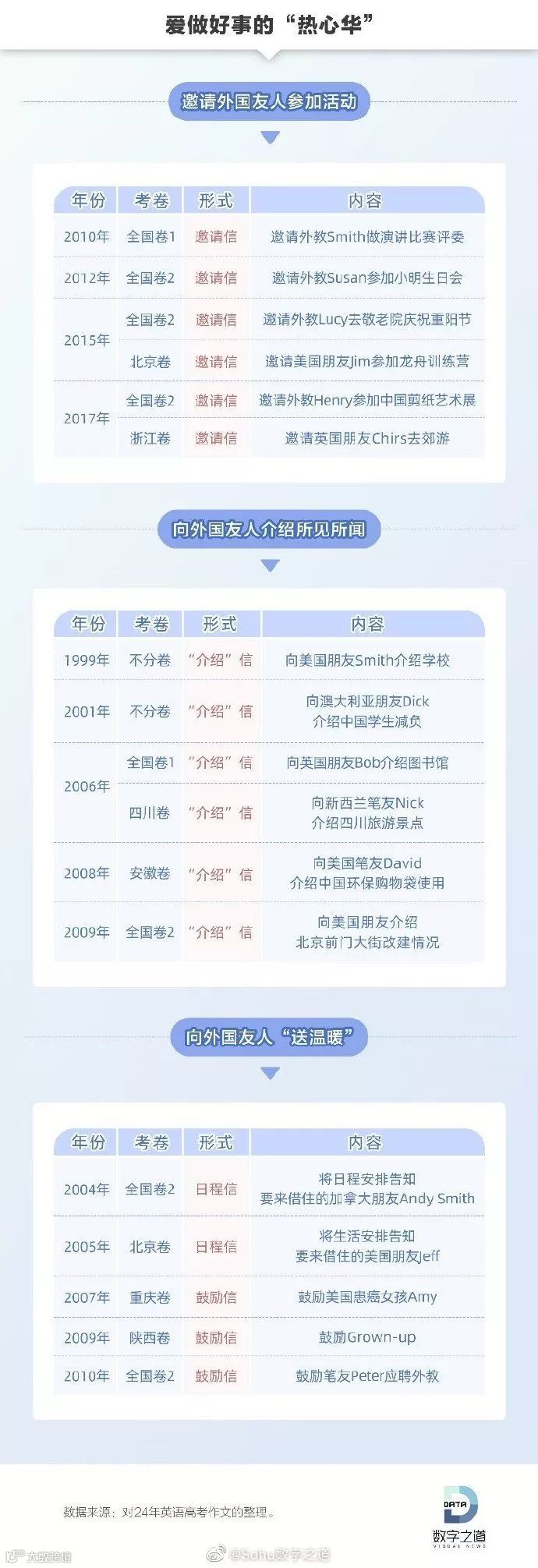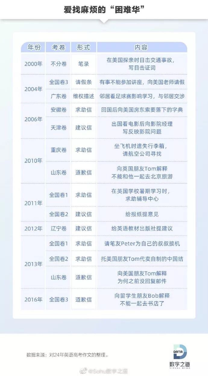 从过去20多年的英语作文题分析来看,李华是个“热心肠”,经常邀请外国友人参加各类活动。他的朋友Jim、Smith、David等来自五湖四海,和李华交往集中在每年高考期间。