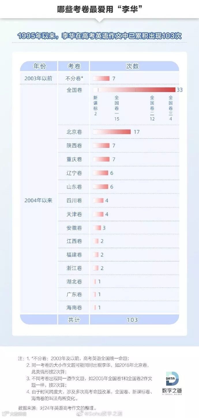 *此次统计数据发布在2019年高考前,因此不包括2019年“李华”出现的数据。