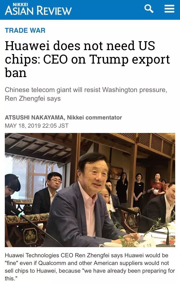 Ren indicated that his company will continue developing its own chips to lessen the impact of the ban on its production. Ren said it would be "fine" even if Qualcomm and other American suppliers would not sell chips to Huawei. "We have already been preparing for this," he said.