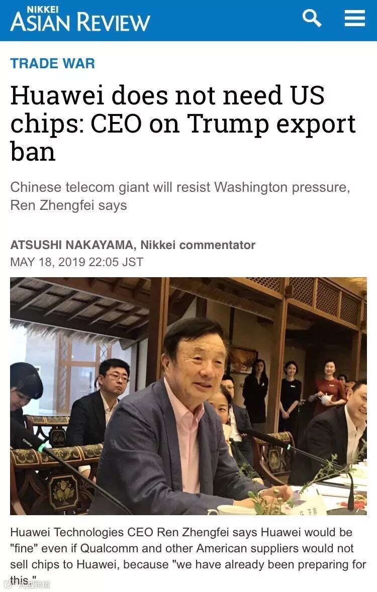 对于出口禁令,任正非表示,对华为影响有限,即使高通和其他美国供应商不向华为出售芯片,华为也“没问题”,因为“我们已经为此做好了准备”。