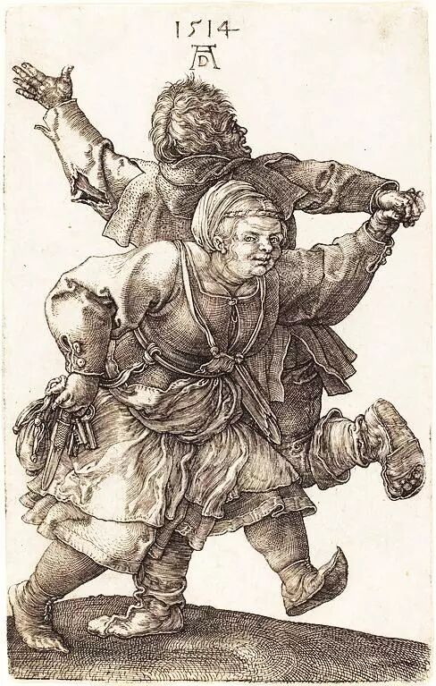 16世纪描绘农民跳舞的德国版画,作者丢勒。画中的农民虽然衣衫破旧,但腰中挂有一串钥匙,由此判断,应该是比较富裕、有些财产的农民。