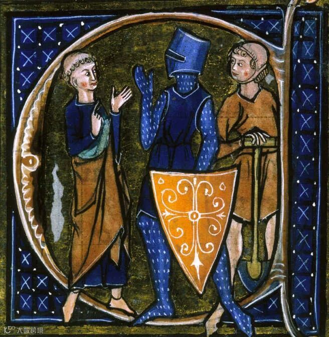 这张图片是13世纪时法国手抄经书中的插图,站在最右面的,就是负责劳作的peasant;可以看到,教士和武士聊得兴起,而农民却只是拄着铁锹站在一边、连话也插不上,地位一目了然。