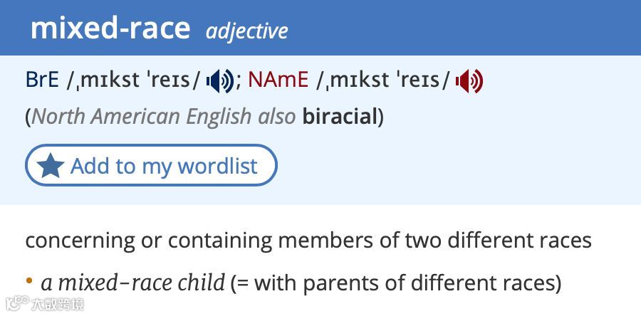 根据牛津词典的释义,mixed-race是形容词,表示“混血的”,造句: