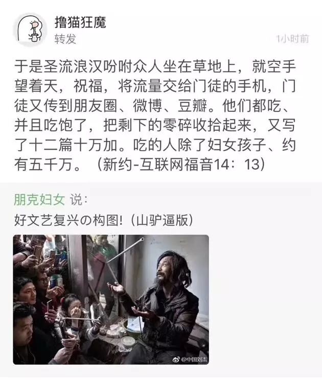 这位网友恶搞了一把《圣经》选段,把原本描述耶稣的段落,套用在“流浪大师”沈巍的身上。结合配图看文字,还真的没有违和感……