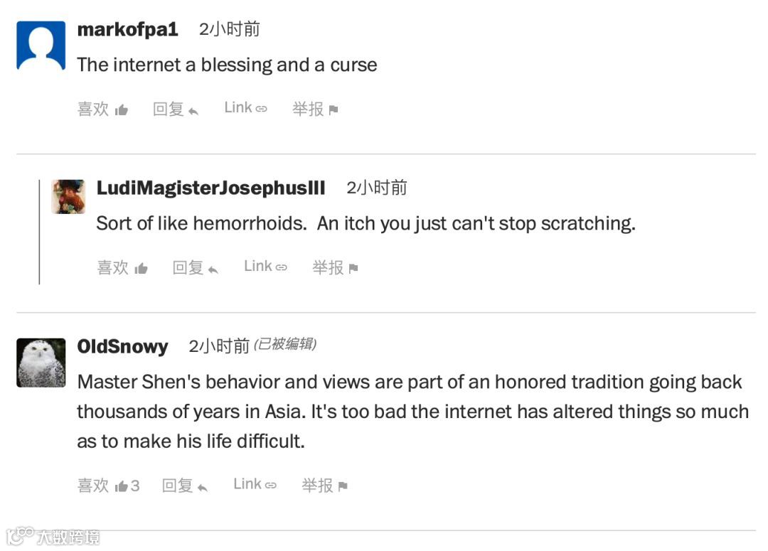 Master Shen's behavior and views are part of an honored tradition going back thousands of years in Asia. It's too bad the internet has altered things so much as to make his life difficult.