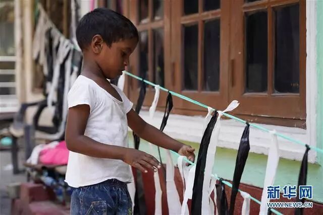 4月23日,在斯里兰卡科伦坡,一名男孩抚摸为悼念爆炸案遇难者而挂起的丝带。新华社记者 林昊 摄