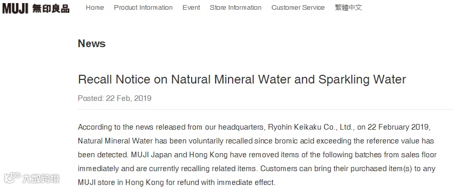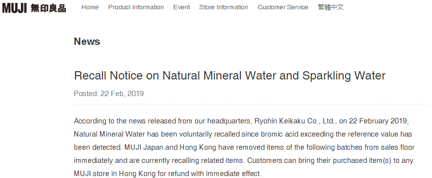 根据我公司总部(株式会社良品计画)2019年2月22日发布的消息,“天然矿泉水”被主动召回,因此前该产品检测出了超过参考值的溴酸。日本和中国香港的无印良品已经立即从销售区撤下以下批次的产品,目前正在召回相关产品。从即刻起,顾客可携带所购物品到香港任何一家无印品门店办理退款。