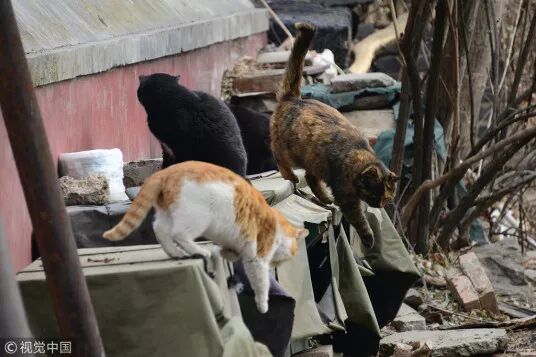 Three stray cats wander at the Wofo Temple in Beijing, Feb 26, 2018. [Photo/VCG]