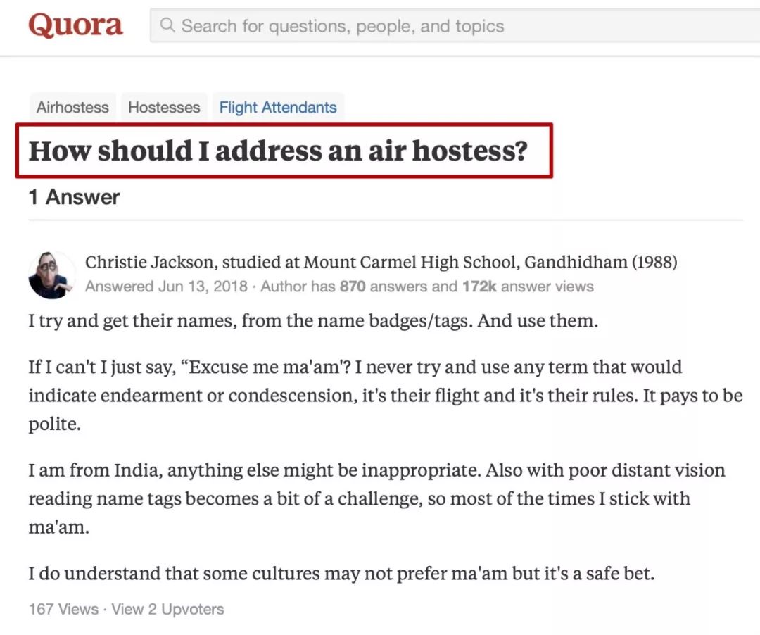 如果我记不住名字,我会直接说:“Excuse me, ma'am”(不好意思,女士),我不会使用其它暗含着“亲昵”或“看不起”等意味的表达。这是他们的航班,他们也有他们的规定,我理应表示基本的礼貌。