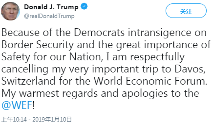 鉴于民主党在边境安全问题上的冥顽不灵,且考虑到我们国家安全的重要性,我要取消前往瑞士达沃斯出席世界经济论坛的重要行程。在此向世界经济论坛致以我最诚挚的问候和歉意。
