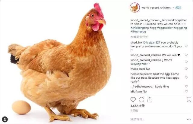 有人上传了一只母鸡的照片,叫world_record_chicken,并声称得到最多点赞的鸡蛋就是这只鸡下的……