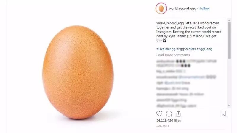 帖子由@world_record_egg在1月4日发表。截至发稿时,这个帖子已经得到3000万个点赞,只用了短短一周多时间就打破了凯莉-詹娜之前保持的纪录。