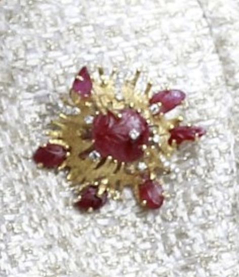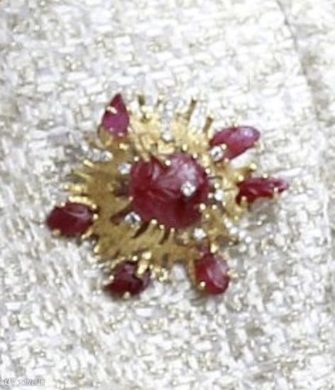 这件宝石胸针是女王的爱人菲利普亲王于1966年赠送给女王的礼物,一直被女王视作珍爱之物,看看女王曾经在多少场合戴过就知道了。