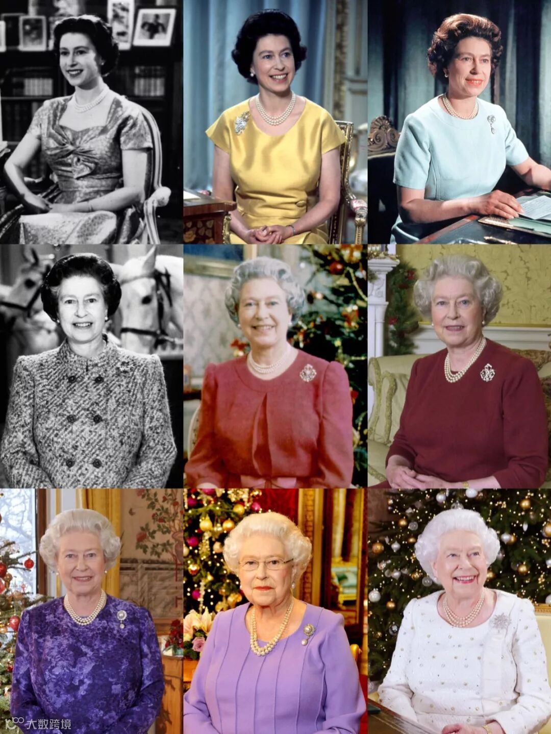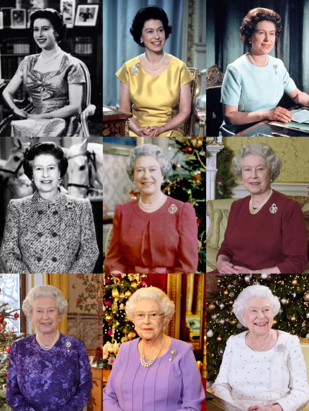 图片依次为1957、1967、1971、1986、1992、2000、2004、2014和2017发表圣诞致辞的女王
