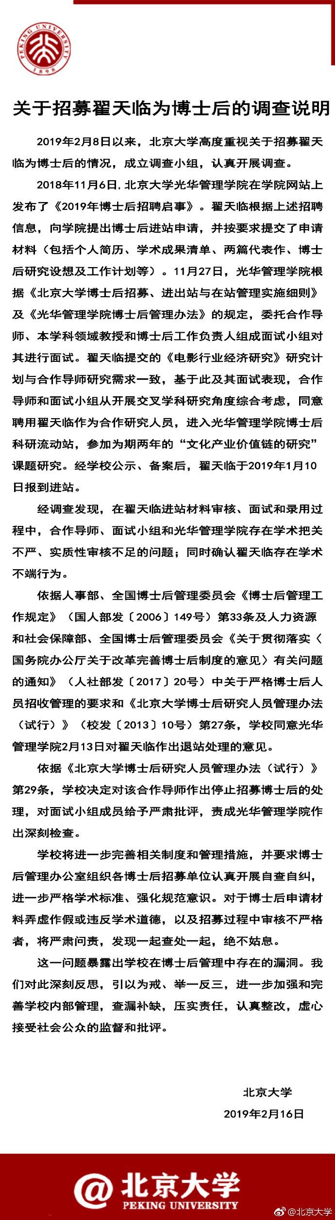 今天(16日)下午,北京大学官方微博发布关于招募翟天临为博士后的调查说明: