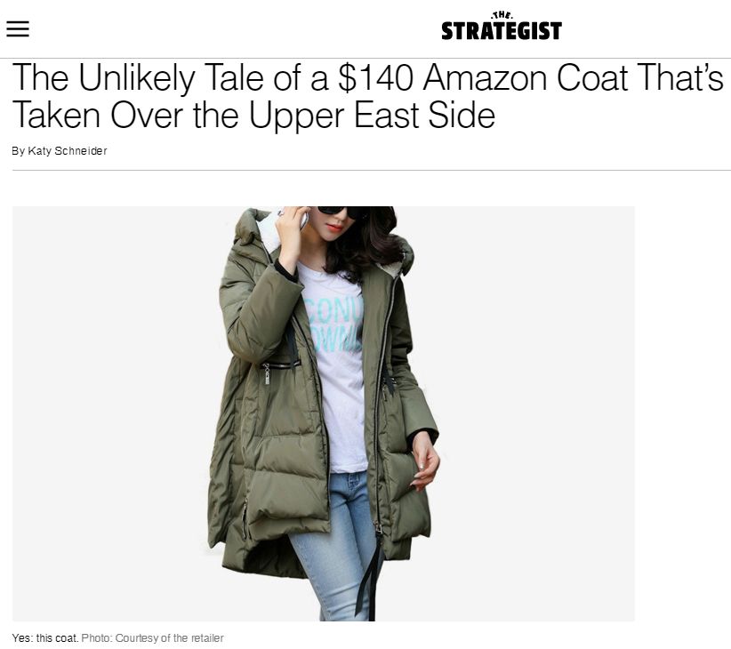 It’s sold on Amazon for $100. And it’s the most popular coat of the winter, at least among a certain set of stylish uptown women.