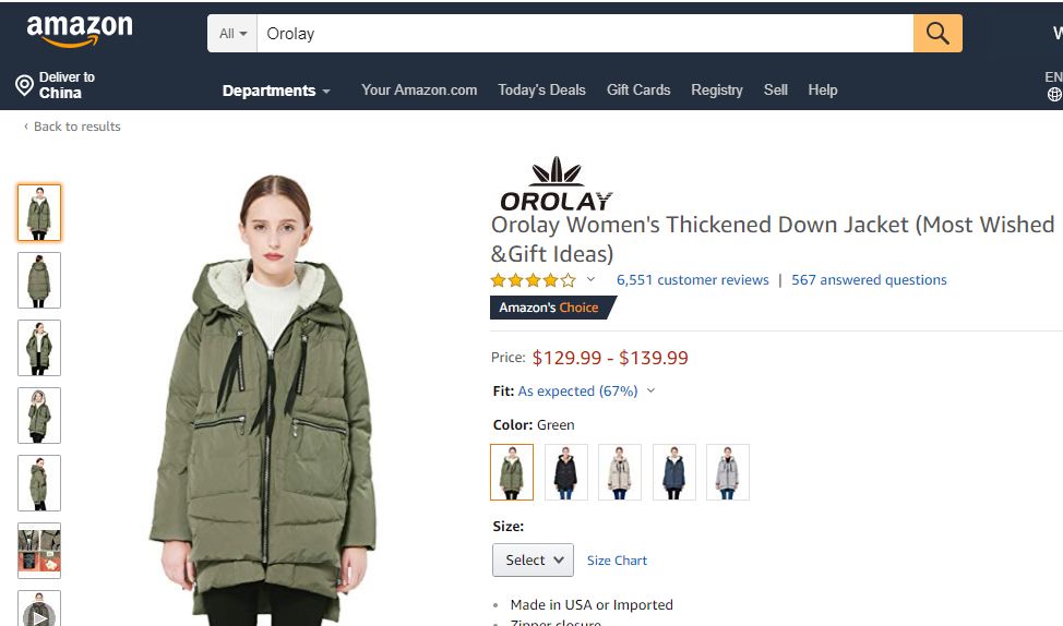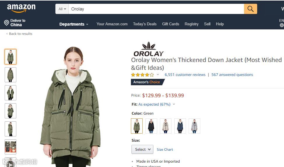美国媒体报道说,这款亚马逊的爆款来自中国浙江的羽绒服品牌Orolay,并且已经连续热卖两年。