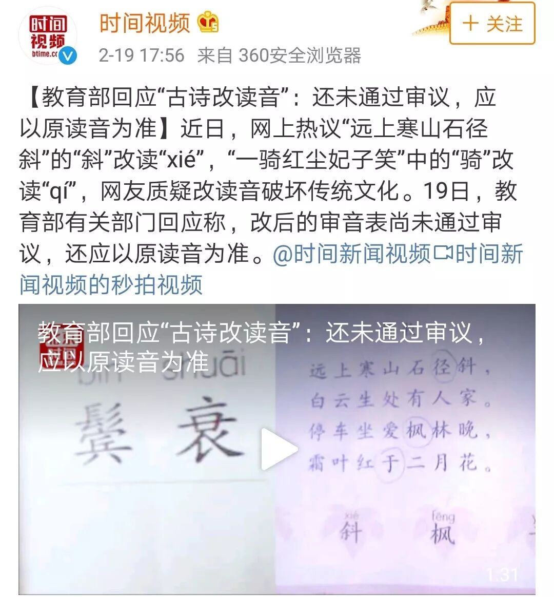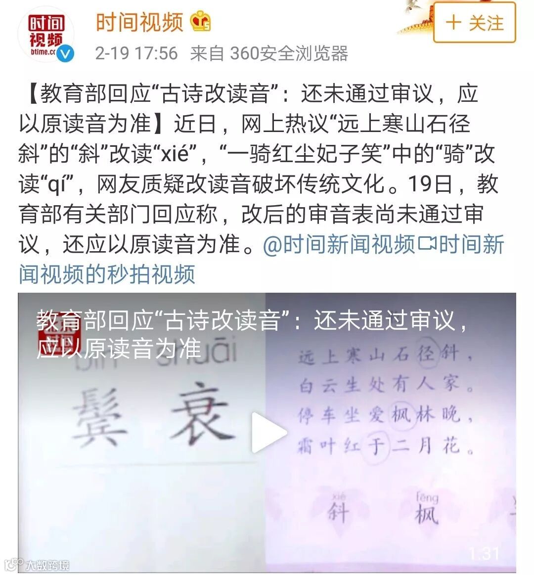 据@时间视频报道,19日,教育部有关部门回应称,改后的审音表尚未通过审议,还应以原读音为准。