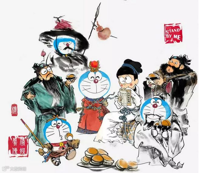 2015年《哆啦A梦》大电影在中国上映时,曾发布过一组京剧版角色海报,把机器猫、大雄、静香带入四大名著中,不得不为设计师的创意点赞。