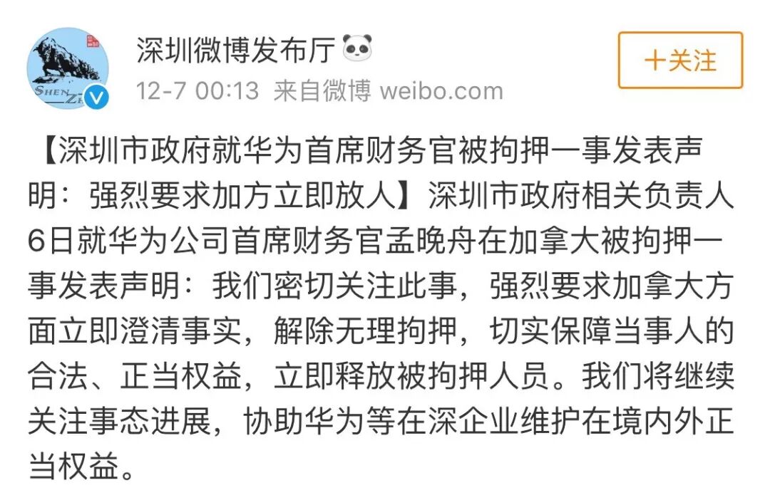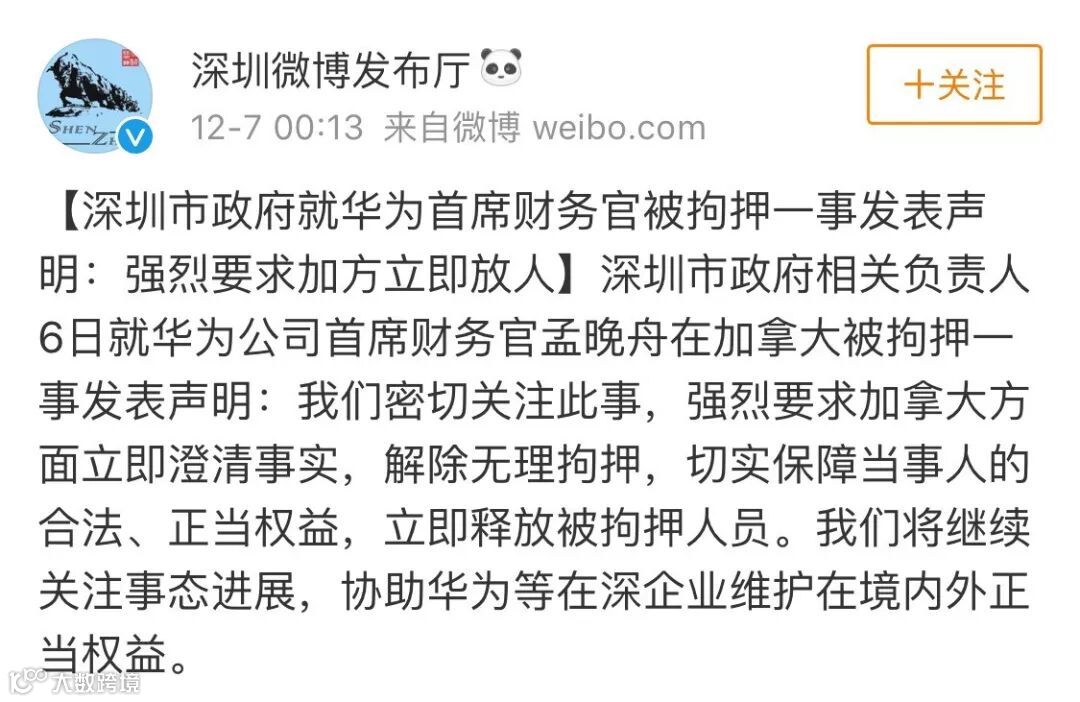 6日,深圳市政府相关负责人就华为首席财务官孟晚舟在加拿大被拘押一事发表声明。