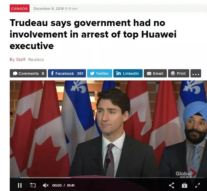 加拿大总理特鲁多6日表示,其政府未卷入中国科技巨头华为高管被拘捕一事,该名华为高管在温哥华机场被拘押。