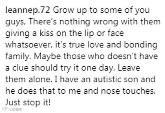 “你们这些人快长大吧。不论他们亲嘴还是脸颊都没有错,这是一个拥有真爱的亲密家庭。或许那些不明白的人应该找一天去试试。别管人家了。我儿子有自闭症,他也这么亲吻我,触碰我的鼻尖。快住口吧!”