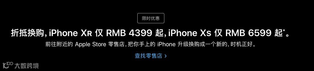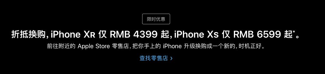 从苹果官网首页可以看到,“折抵换购iPhone XR仅4399元起,iPhone XS仅6599元起”。