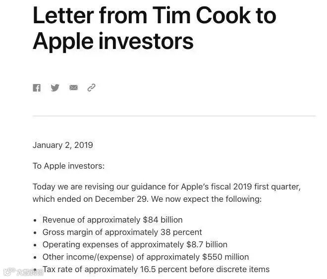 库克在信中提到:将2019财年第一季度营收预期,从此前的890亿—930亿美元下调至840亿美元。而这则远低于市场预期。