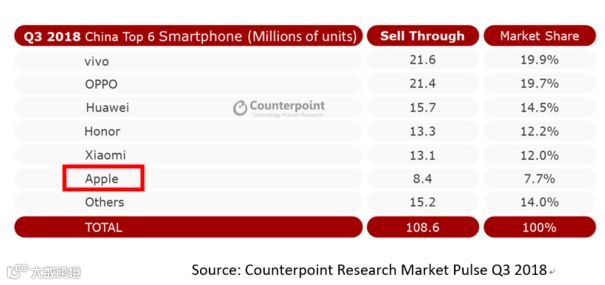 根据Counterpoint Research统计的2018年第三季度中国智能手机市场份额数据:苹果已排至第6,被vivo、华为等进步神速的国产品牌远远甩在后面。