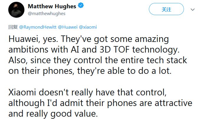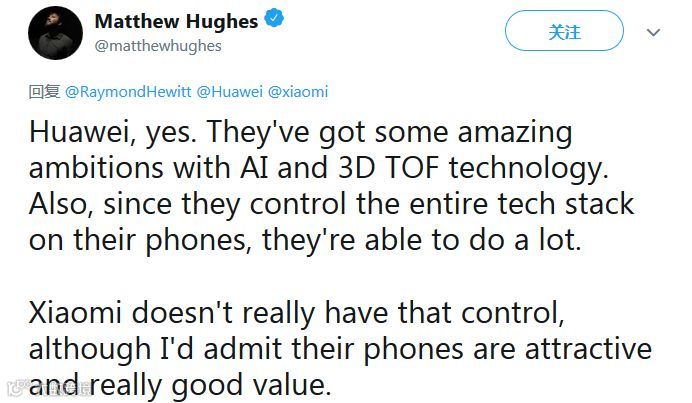 华为不断更新AI和3D TOF技术。他们控制着手机生产的整个流程,他们能够做很多事情。小米虽然没有整条产业链,但我觉得他们的手机很有吸引力, 真的很有价值。