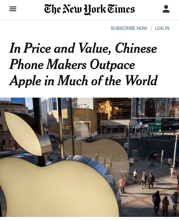 《纽约时报》的分析文章称:无论价格还是价值,中国手机生产商都在世界大部分地区超越了苹果