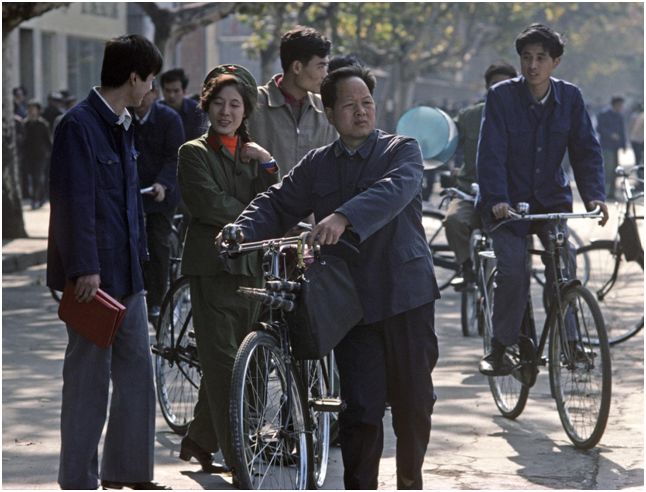当时人们都穿着中山装,骑着自行车,生活很简单。