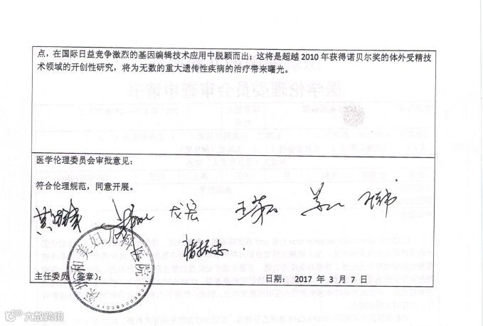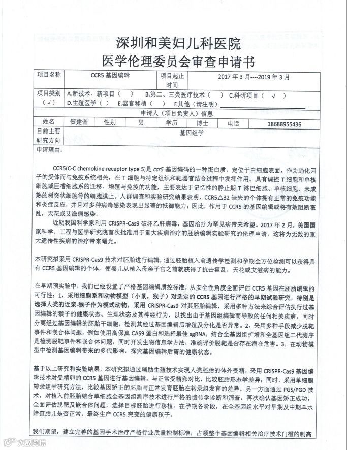 不过,从贺建奎在中国临床试验注册中心提交的《HIV免疫基因CCR5胚胎基因编辑安全性和有效性评估》中可以看到,该项目获得了深圳和美妇儿科医院医学伦理委员会批准。