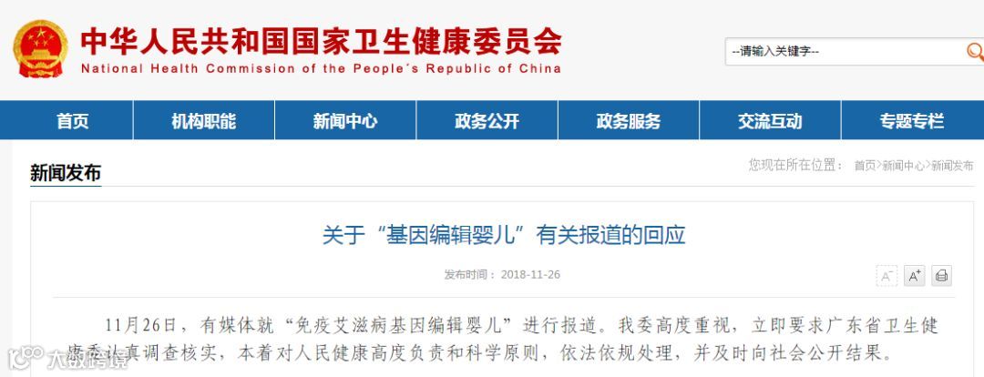 26日晚,国家卫生健康委员会网站也对“基因编辑婴儿”进行了回应: