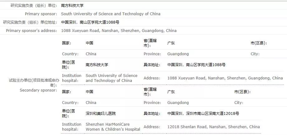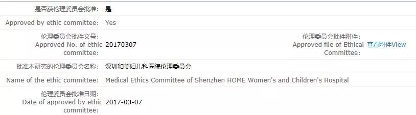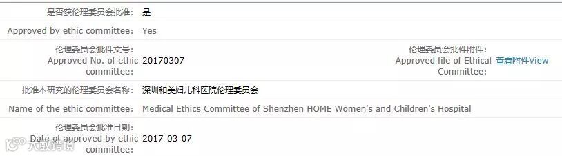 此外,这份官方注册的信息表上还显示,该试验已经得到伦理委员会的批准(approved by ethic committee),批准单位为深圳和美妇儿科医院伦理委员会 。